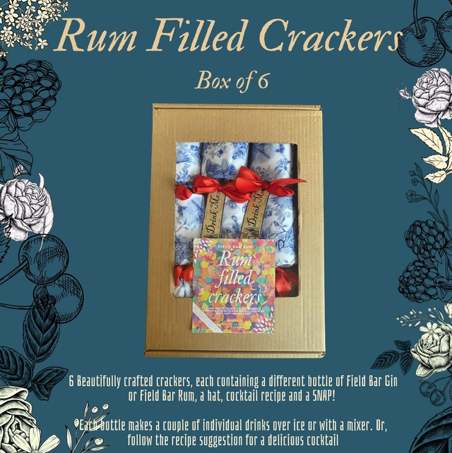 Box of 6 beautiful crackers. Each one filled with a bottle of Rum, cocktail recipe, party hat and a SNAP!